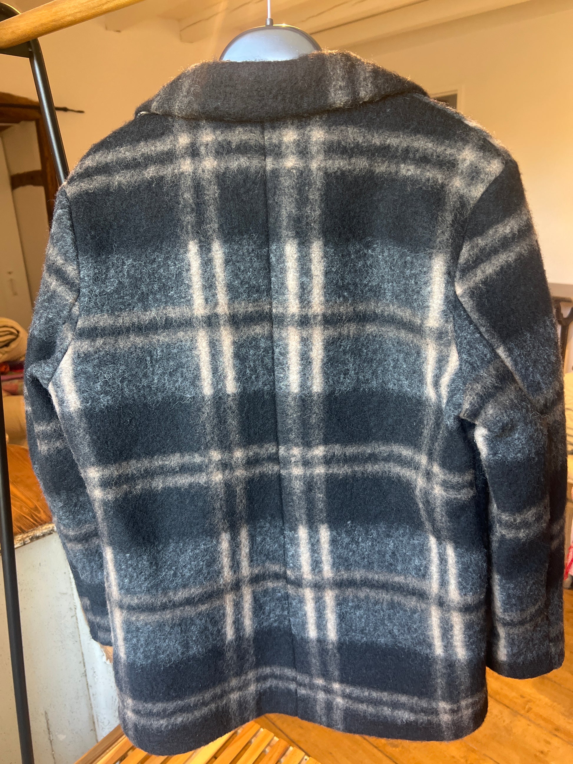 Veste blazer très chaude à carreaux, tons noir et beige.