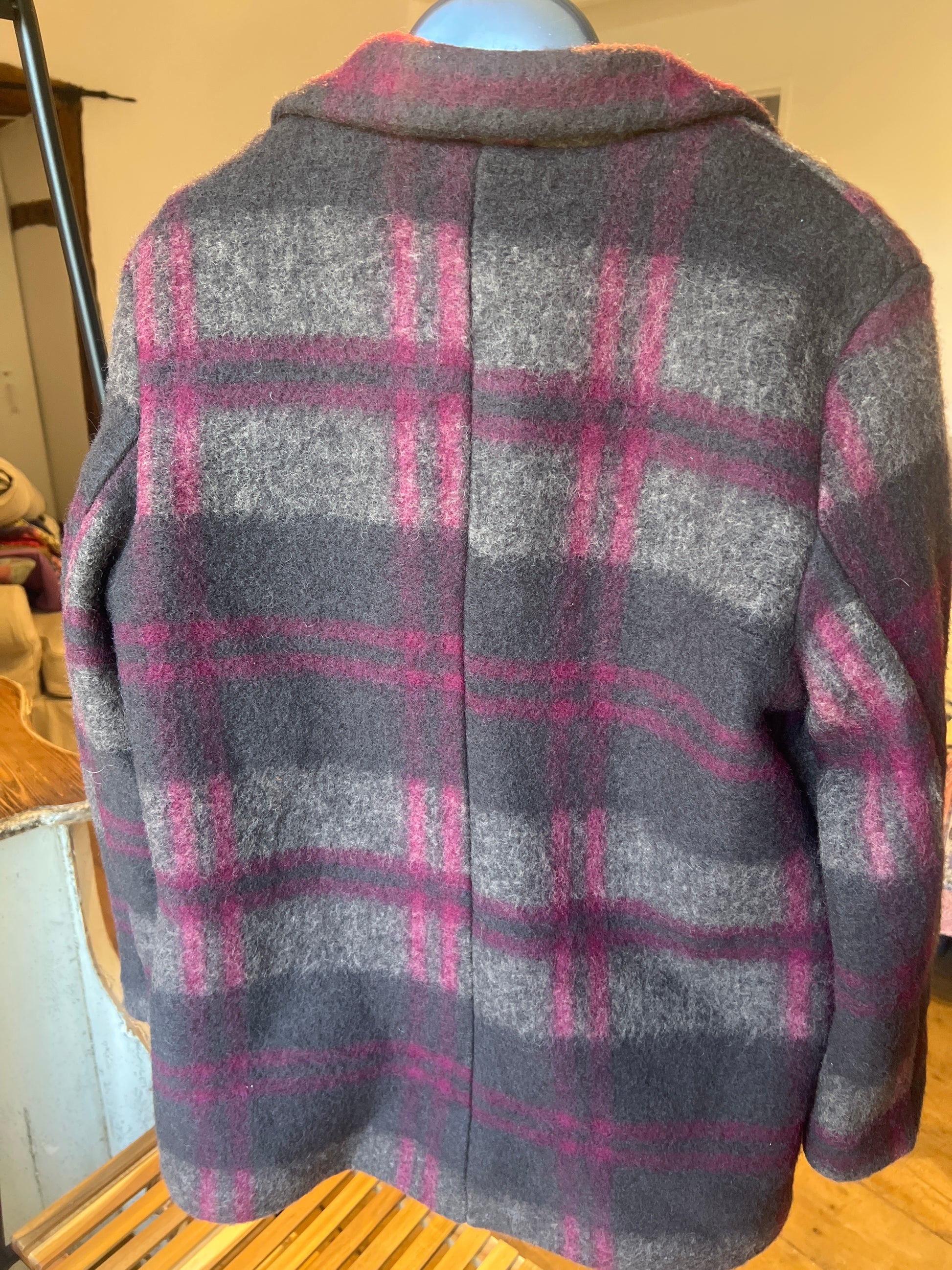 Veste blazer très chaude à carreaux, tons noir, gris et prune.