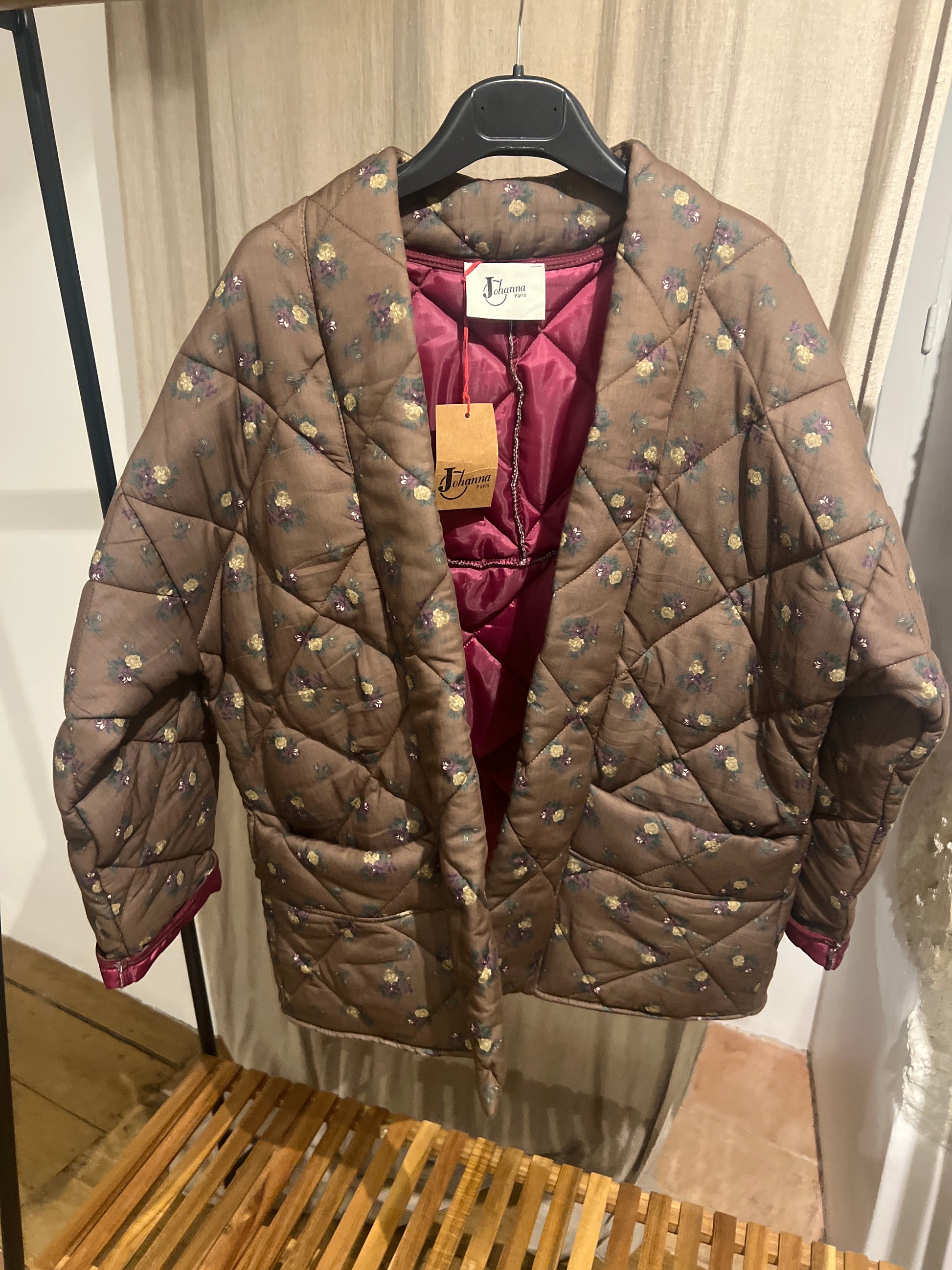 Veste kimono matelassée choco imprimé fleurs, doublure bordeaux.