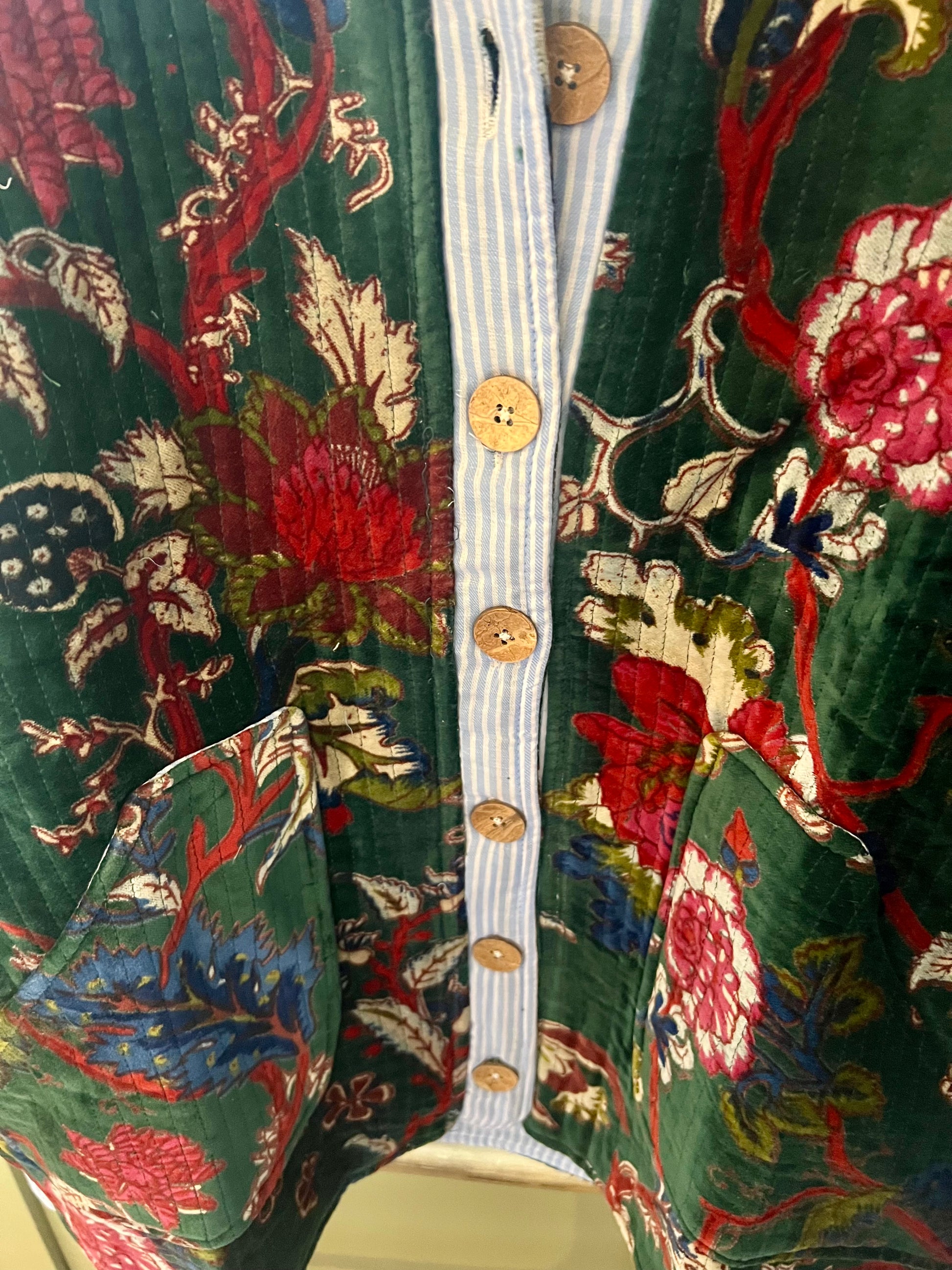 Veste en velours matelassé doublée coton rayé, 100% coton.