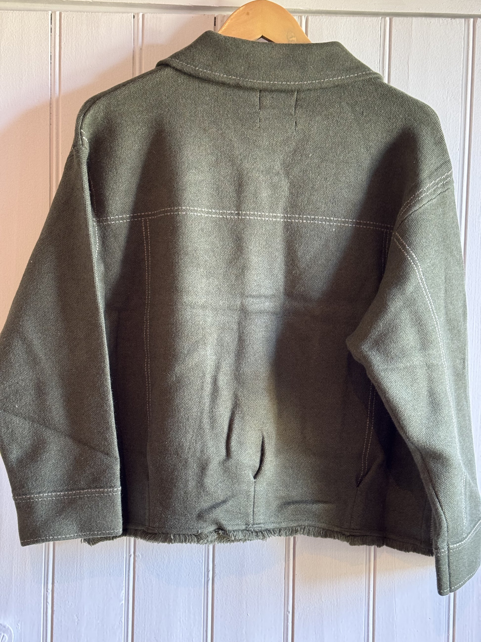 Dotée de poches à rabat à l'avant, elle offre une touche pratique tout en conservant un style raffiné. Les surpiqûres tout autour ajoutent une note de sophistication, tandis que la fermeture par boutons à l'avant assure un ajustement parfait. L'ourlet brut à la taille apporte une finition moderne et décontractée, faisant de cette veste un choix polyvalent pour toutes les occasions.